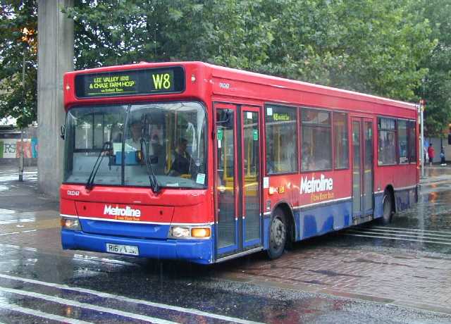 The new contract, which took effect from 26th July 2003, is with Metroline based at Potters Bar and there is a new fleet of TP double deck buses and a much improved frequency of 8 minutes during the day and 12 minutes in the evenings and on Sundays. The Metroline TP is nominally the same bus as the First TN (i.e. same combination of Dennis Trident chassis and Plaxton President body) but has four years more development which includes a new engine to meet new emissions standards and a new coil suspension. This means that whereas the TN was regarded as noisy, a rough ride and generally a heap of junk, the TP has been well received. Unfortunately it also meant that when they did a test run the bus scraped the underside of the railway bridge on Church Street. It is believed by bus enthusiasts that the problem is caused by the different suspension. Although a local newspaper refers to a 'mistake' by the manufacturers in making the bus two inches too big I suspect it isn't quite so straight forward as they make it sound. Anyway the end result is that the service is being operated by type DLD and DML single deckers temporarily (pictures above) and Church Street is being closed for three weekends in August 2003 to drop the level of the road by five inches at a cost of some £100,000. The bill is apparently being picked up by Transport For London but it would be nice to think the operating company or the manufacturers were bearing part of the cost as at the end of the day they have to bear responsibility.